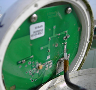 En regardant de plus près j'ai découvert que le dôme de l'antenne, cuit par le soleil, était devenu très tendre (il se pelait à l'ongle) De micro-fissures étaient apparentes, d'où je pense l'origine de l'eau. Il faut dire que le dôme est fixé à la base par la face inférieure de l'antenne à l'aide de vis auto-foreuses qui initient les fissures.