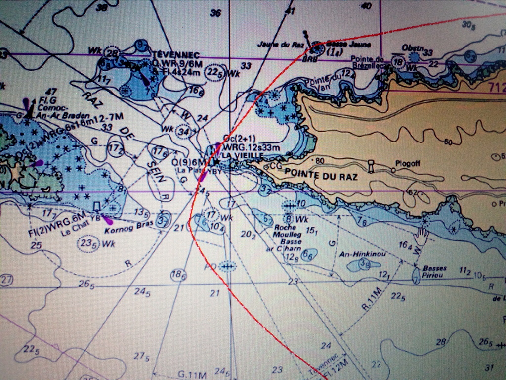 Depuis 1973, j'ai passé le Raz de Sein, de 40 à 60 fois dans les deux sens. Parfois dans des conditions rudes, jusqu'à 30 nds de vent réel et parfois à contre-courant ( en course ou en venant d'Espagne).