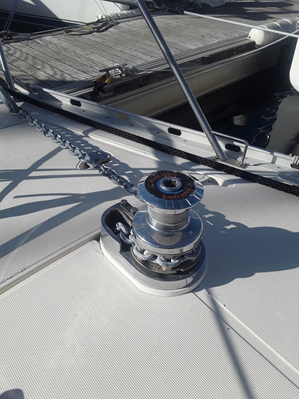 Inconvénient de ce positionnement : la chaîne ne descend pas seule à l'endroit le plus profond de la baille à mouillage.