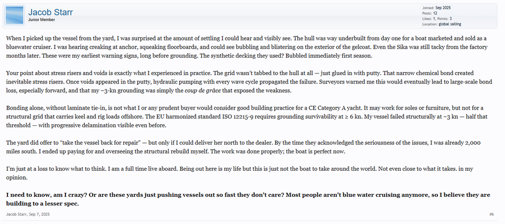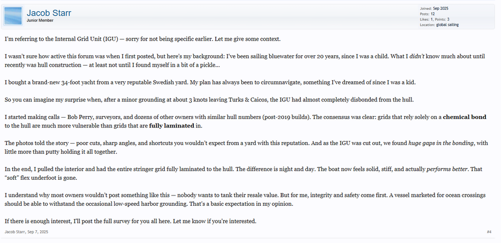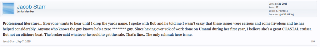 @H6684. Je ne sais pas quelles sont les pratiques américaines. Mais ce qui peut amener le complotisme ou les rumeurs, c'est de retrouver dans les forums de boatdesign.net le même nom/pseudo, qui parle d'un voilier de même nom que l'annonce de vente du HR340 plus haut, qui serait un 34 pieds récent d'un constructeur suédois très réputé, sans jamais nommer la marque ou le modèle. Et qui aurait un contre moule mal collé dès le départ, au point qu'il se serait décollé lors d'un talonnage à 3 nœuds.