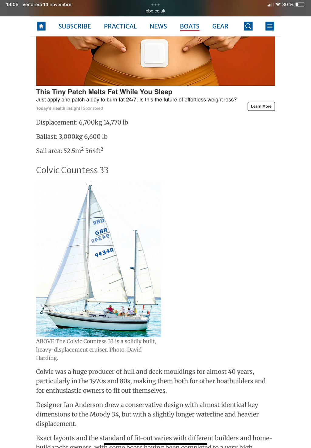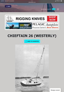 Il me semble que c'est une unité made in UK. (Early Moody? Meme hublot arrière que leur 33´ Angus Primrose?) Grée en ketch (il me semble deviner la cadène d'artimon au niveau de la pièce noire sur le roof arrière, sabot?) bien qu'elle devrait être comme les cadènes de grand-mât... Mystère.