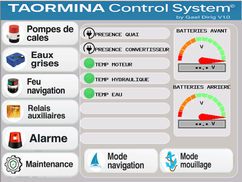 je m'appelle gael suis entrain de construire un catamaran de 17m de long en aluminium qui est fini a 90% et est a flot deja. je suis entrain de faire un systeme de gestion par HMI pour mon catamaran je voudrais avoir vos avis et si je n oublie rien comme circuit de commande. cest une premier version avec un acces aux differente pages, une gestion automatique des pompes de cales et cuve eaux noire,relais de puissance,alarmes, orodametre, presence quai ou port, tension etc...merci