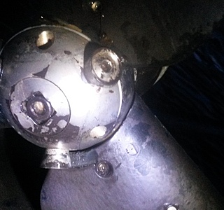 Avant hier à l échouage , sitot la garcette enlevée , le ressort a rappelé l hélice , prète a se mettre en drapeau .( babord )
