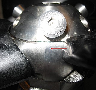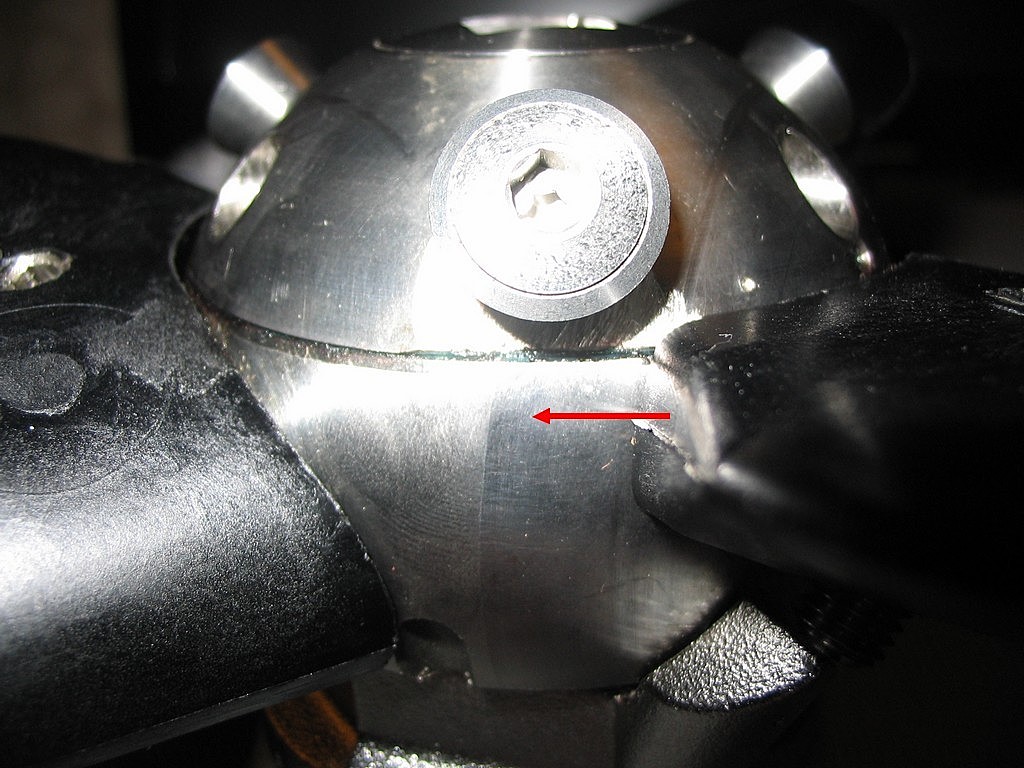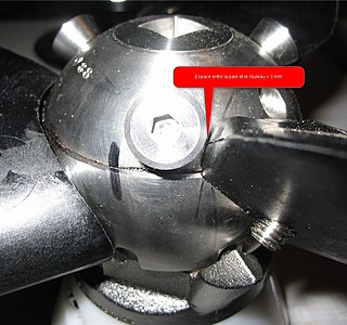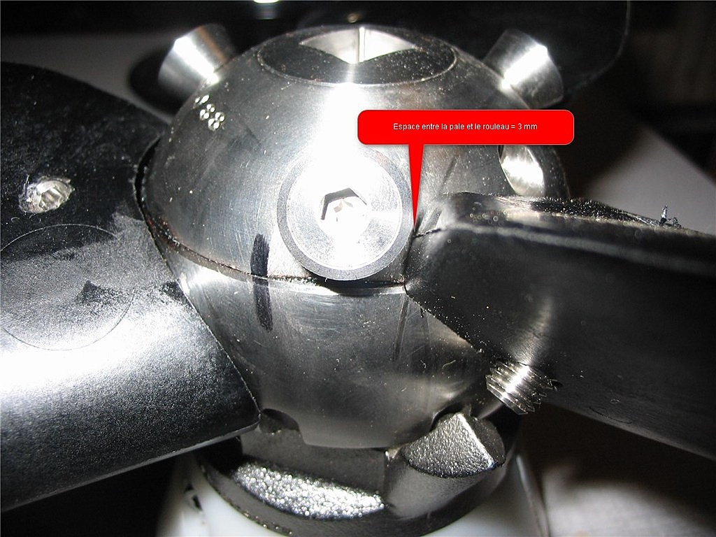 Si l'arrière de la pale est plus loin dans la direction de la flèche et passe sous le rouleau, alors il y a un décalage entre le corps de l'hélice (partie avec le cône en delrin) et le tripode (fixation des pales).