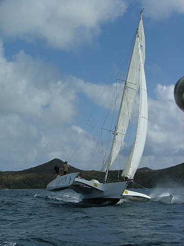 Si la torsion est le plus visible, coque centrale qui se transforme en banane n'est pas à exclure non plus. Cela peut arriver avec une GV à corne avec tissu exotique et un palan très démultiplié, ou des bastaques sur un trimaran à structure souple. Ce phénomène est bien connu des anciens coureurs sur les trimarans premières générations avant l'arrivé des coques en sandwich (il fallait faire léger, c'était donc souple). Le monolytique étant moins rigide, il ne fallait pas trop souquer les bastaques car dans tous les cas l'étai faisait le dos rond (voir photo).