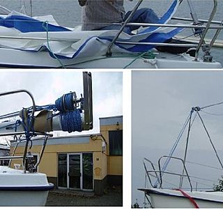 Si tu n'as pas de chèvre, tu peux utiliser la bôme, mais en basculant vers l'avant. Je procède comme ça pour démâter seul, quand je n'ai personne pour me hisser en haut du mât pour bricoler.