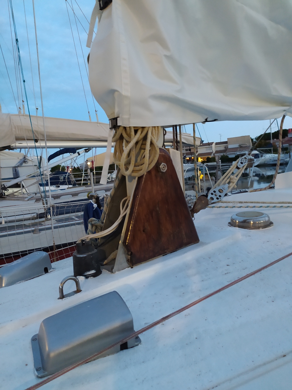 4)Pour moi, à l'avant, le mât était posé sur le balcon (avec protection et fixation en bois) et pour les manoeuvres, on enjambe le mât, ... c'est moins dangereux pour la tête.