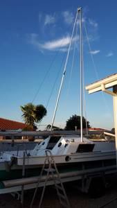 Pour mater et démater mon trimaran (speed 770) qui a un mat de 10m ,j'utilise une bigue que j'ai confectionné avec 2 tubes en alu qui me permet de lever le mat et de le faire basculer pour le poser sur le pont.