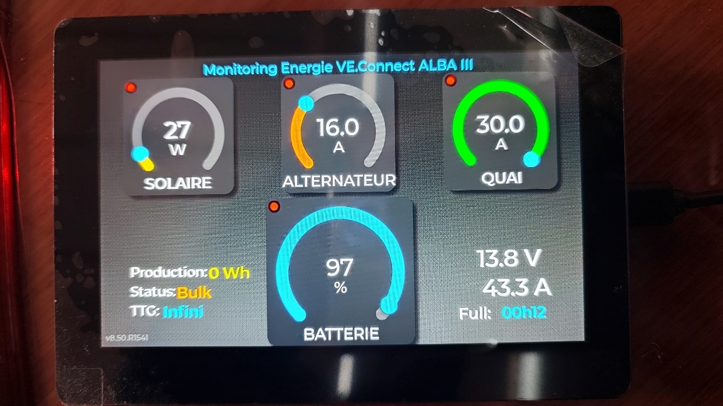 Il reste des points de détails mais qui ne font "pas fini". Par exemple pour chaque jauge en arc de cercle il y a un voyant rouge qui clignote comme une led indiquant qu'on reçoit bien des données bluetooth de la part de l'appareil en question. En ce moement ce clignotement n'est pas bien cadencé. Ou bien il y a l'affichage du TTG (Autonomie de la servitude en temps j/h/mn ) qui se met à "infini" si le BMV712 n'émet pas alors qu'il devrait afficher "---".