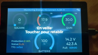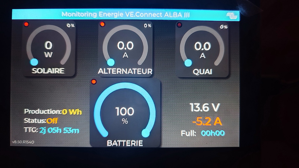 Cet écran donne donc la production solaire (Smart Solar), celle du moteur (Orion XS) et du chargeur de quai (IP22) ainsi que la SOC de la servitude (BMV712). Plus d'autres données de bases comme l'autonomie en durée ou le temps jusqu'à charge complète.
