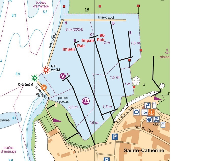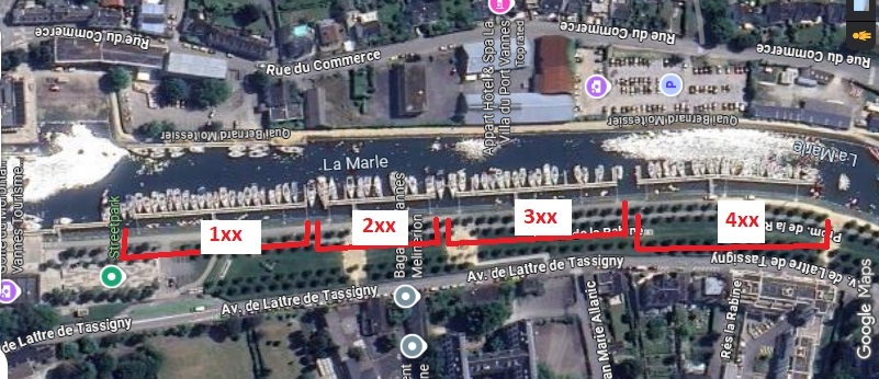 Et il serait bien que la numérotation ne soit pas difficilement visible car plus ou moins masquée par les équipements des catways. Exemple les Bas Sablons à Saint-Malo