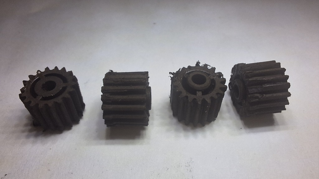 Quand on voit l'usure des pignons, ne pas espérer que des engrenages en impression 3D durent plus de quelques heures à charge modérée, et quelques minutes à charge élevée.