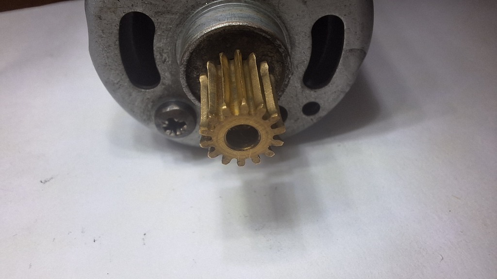 Concernant le moteur et son pignon, on trouve chez les chinois des Mabuchi RS-555SH monté avec un pignon laiton de 14 dents, pour une dizaine d'euros. Pour l'instant pignon d'une largeur de 5 ou 7 mm, pas encore trouvé en 9 mm mais je garde espoir.