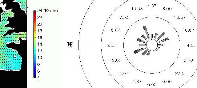 • placez votre souris sur un point et vous avez la rose des vents qui s'affiche à droite . (On peut faire une copie d'écran genre gadwin printscreen(avec la flèche pour indiquer le point choisie)) Les données ont été recueillis par le satellite QuikScat pendant 5 ans (je crois qu'il est mort depuis décembre dernier)