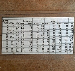 J'ai, grâce au module polaire d'opencpn, transcrit la polaire au format CSV; j'ai un peu extrapolé à la louche pour les plages de vent supérieur qui ne sont intégralement retranscrit et cela s'arrête à 24 nœuds, mais bon cela fait une base de départ.