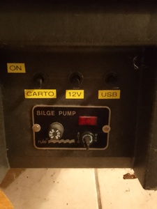 Et dans mon poste de pilotage j’ai intégré un petit tableau avec les interrupteurs manuels, initialement je voulais installer des capteurs d’eau à deux broches et diodes pour chaque pompe mais toujours pas fait… les pompes sont installées bien au-dessus de la ligne de flottaison et les batteries aussi .