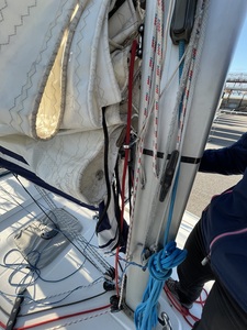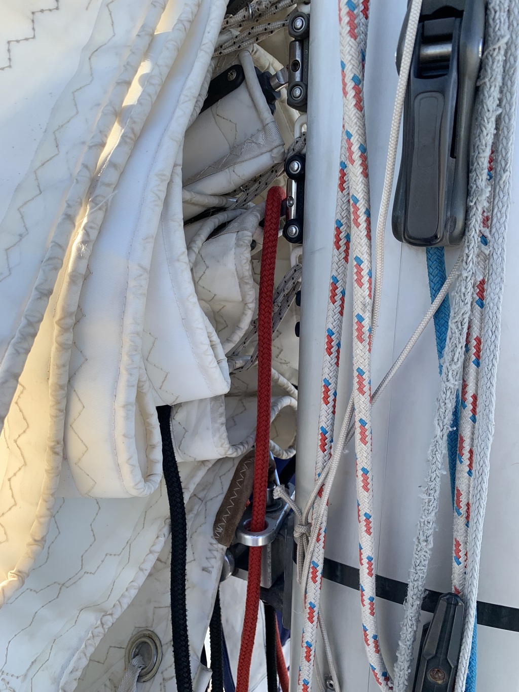 J avais ce système de ris en continu , un bout à l avant, et un bout a l'arrière de la grand voile. Bien que le passage de la bosse de ris doit très à l avant du vit de mulet, je n ai jamais réussi à avoir une voile assez plate. J ai mis deux bosses par ris ,une à l avant de la grand voile,et une à l arrière.