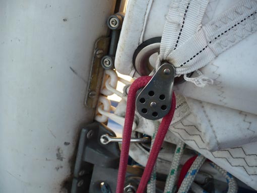 Oui, c'est mon bateau, ça fonctionne parfaitement. Je précise que les sangles sont d'origine pour renforcer l'œillet de ris, je n'ai fait que rajouter la poulie. Mais il n'est pas trop difficile de coudre une sangle, je l'ai fait pour un point d'écoute d'un vieux génois qui était en train de lâcher.