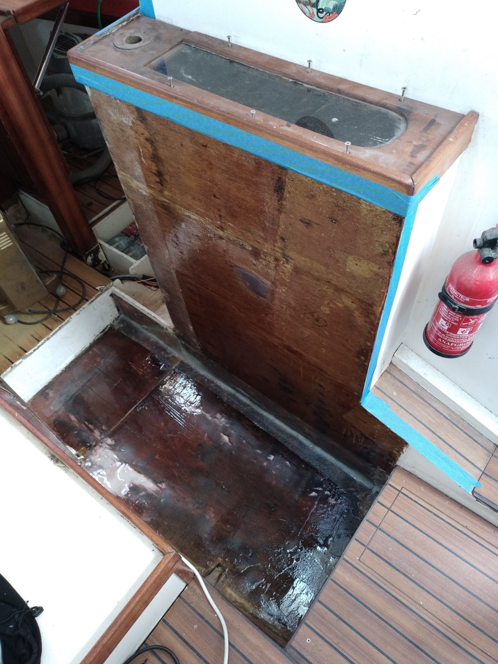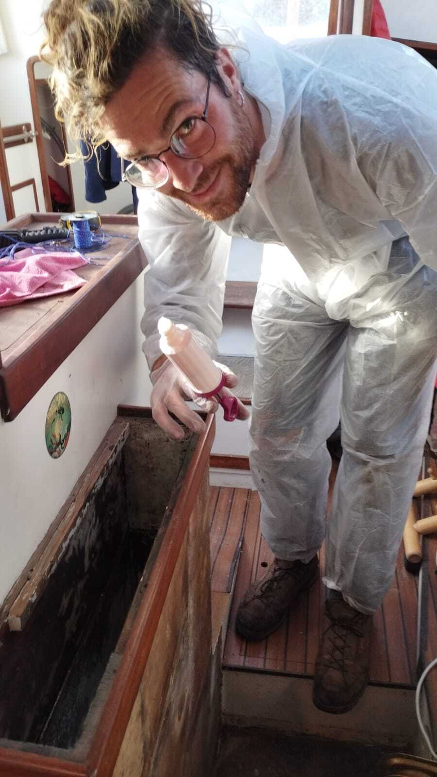 J'ai fait ensuite une imprégnation époxy de tout le bois apparent, de nouveaux joints congés à l'intérieur et une stratification époxy à l'extérieur.