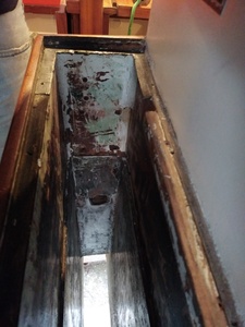 Puis ponçage de l'extérieur du puit(dans le bateau quoi), enlevage du bois pourri ça imbibé, et séchage intensif du bois.