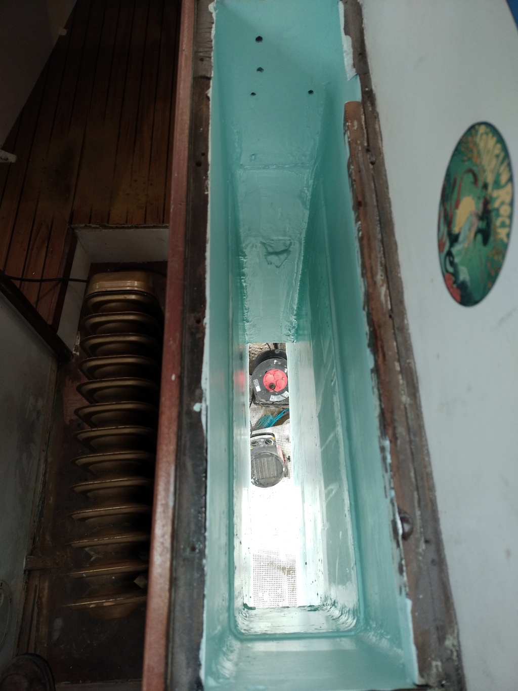 Pour finir, 2 couches de primaire époxy et anrifouling matrice dure dans le puit, et lissage époxy chargé puis primaire mono composant et toplac pour l'extérieur du puit.