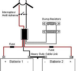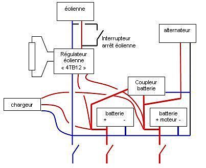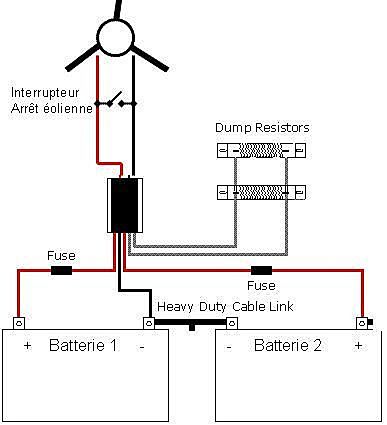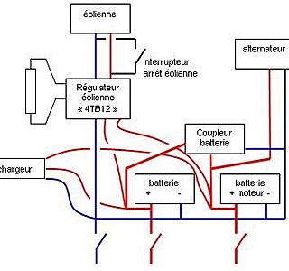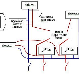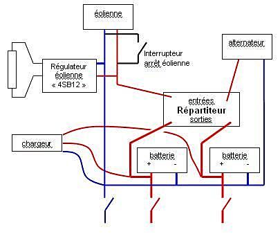 Il faut (à mon avis) raccorder au plus près des batteries, et indépendemment de tes robinets divers et variés. Entre l'éolienne et les batteries, il te faut un régulateur et un répartiteur de charge pour charger tes 2 batteries en même temps. Pour le répartiteur, pas besoin de prendre un modèle cher, car les intensités à faire passer ne sont pas si énormes que ça. De simples diodes de puissance peuvent suffire.