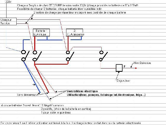 Qu’il y a une petite inversion dans les termes amont est avant pour une rivière en remontant le courant et aval vers la vallée donc après ceci ayant une importance dans le sens ou il ne faut pas laisser les régulateur "en l'air" ils doivent toujours être connectés. J’ai un montage dans ce sens, un inter va et vient directement sur mes batteries, ce qui fait que j'ai toujours une batterie en charge ou entretien. Comme j'ai ceinture et bretelles, panneaux solaire et éolienne en // sur la commande. Mon installation est un peu plus complexe 4 batteries de 140ah avec chargeur 4 sorties autonomes de 70ah vieux lourd mais qui fonctionne tellement bien et en cas de pb facile à dépanner, 100w en panneaux solaire et éolienne aérogène 4, 2 coupleurs manuel sur les batteries et un jeu d'inters pour les panneaux et éolienne pour sélectionner la batterie à mettre en charge. Peut être un peu fastidieux, mais 4/5 mois sans rentrer dans un port sans pb. Un chema de mon cablage est sur le site