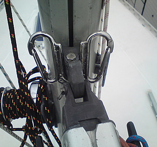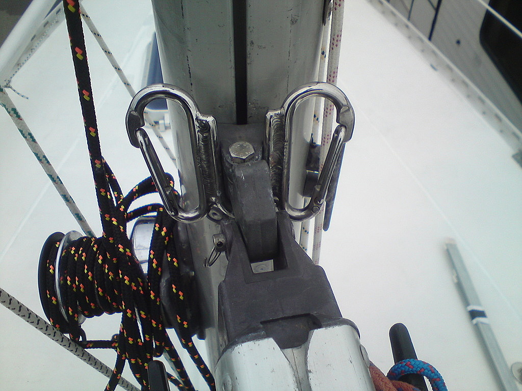 Comme j'ai tout en pied de mât et comme les oreilles de chien s'accrochent facilement mais se décrochent encore plus facilement, j'ai modifié les crocs de ris.