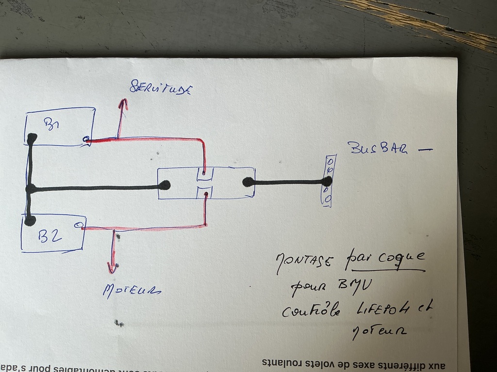 J'ai dessiné très schématiquement l'installation actuelle, en PJ. Nota : le commutateur permet de connecter les deux LiFePo4 l'une à l'autre, si nécessaire, ou de changer de batterie de service (LiFePo4) pour alimenter mon "12 volts" général. Je peux connecter chaque batterie plomb de démarrage à la LiFePO4 de la même coque, si nécessaire, à l'aide d'un switch généralement déconnecté. Chaque coque dispose d'une grosse barre de connecteurs pour les + et les - ...