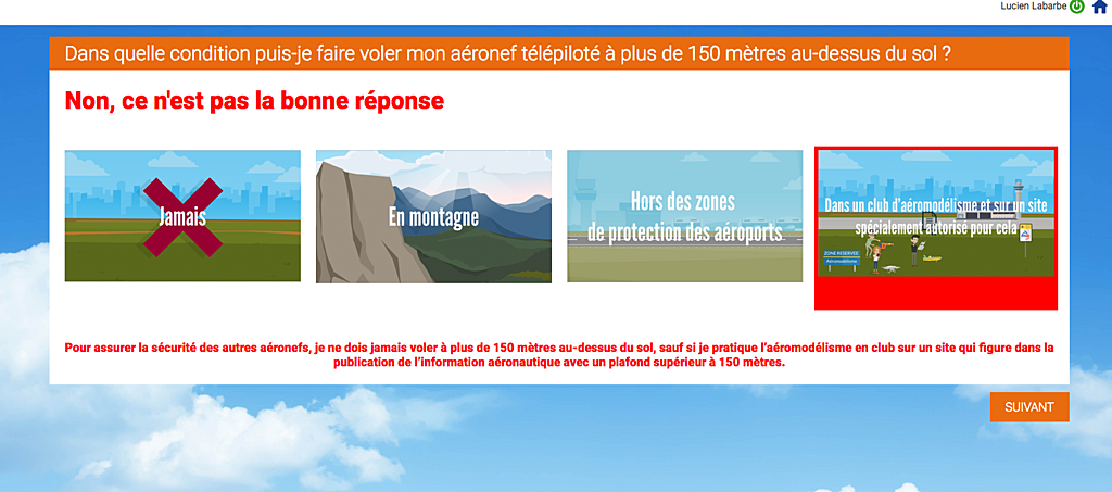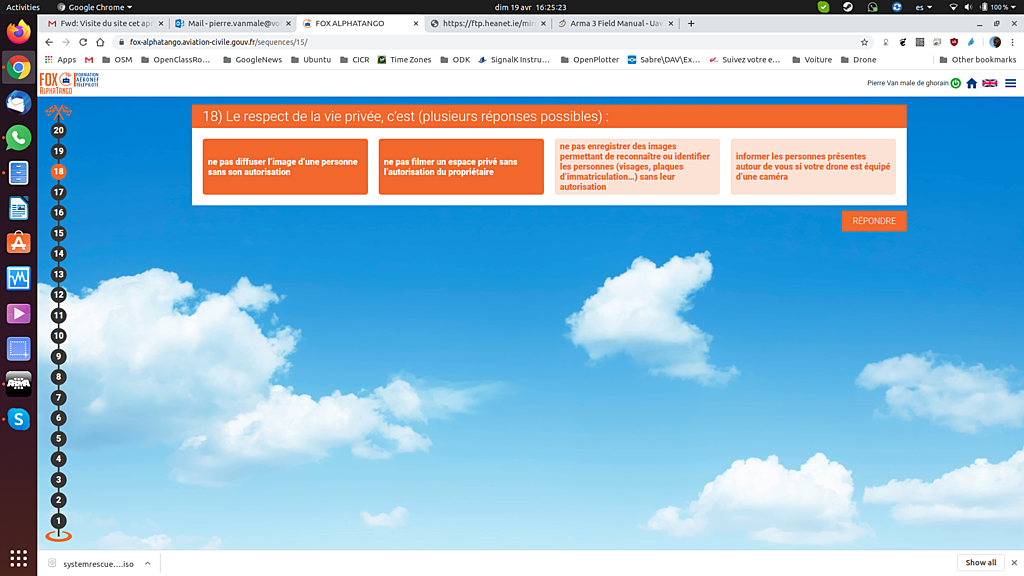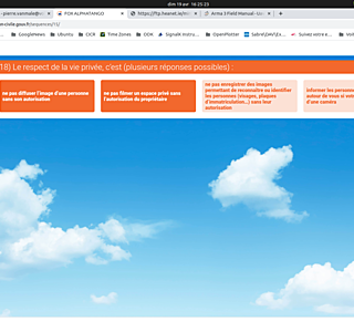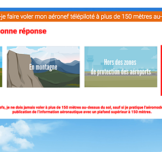 Au besoin, je peux également vous inviter à consulter la page 26 du même guide Aéromodélisme, pour compléter la formation Fox AlphaTango ('En vol : les règles' par exemple). Vous pouvez aussi consulter le site de la CNIL. Vous pourrez constater que votre sélection de "réponses" n'est pas complète.