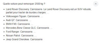 CfCfCf:Il y a des voitures, genre 2.0 diesel qui ont un poids à vide de l'ordre de 1550-1600kg, un PATC de l'ordre de 2000-2200 kg, avec un PTRA de 4000 à 4250kg qui peuvent remorquer au moins légalement des remorques de 1800kg à 2000kg avec simplement le permis B96. Attention aux hybrides qui peuvent être plus lourdes et soit remorquer moins, soit nécessiter le permis EB.·le 06 oct. 15:20