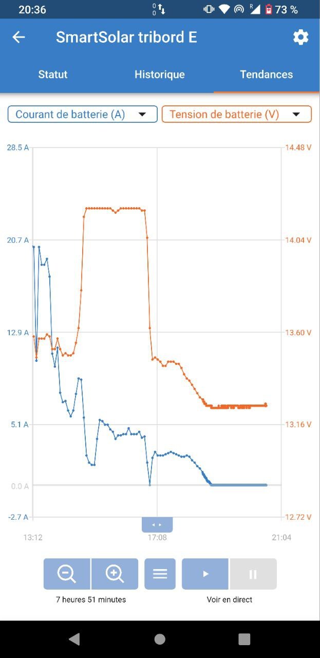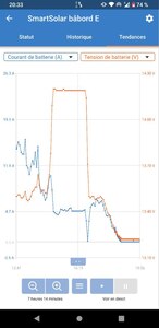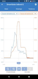 Fabien83:@Menkar, sur tes captures d'écran, sur la première et la troisième, la durée de la phase d'absorption est d'environ 2h. Avec ma batterie LFP en tout cas, au bout de 2h d'absorption il n'y plus aucun courant qui entre dans la batterie, et même largement avant. C'est à mon avis beaucoup trop long si tu veux prendre en compte les préconisations indiquées ci-dessus. Par ailleurs, les graphes et autres infos affichées par les MPPT ne donnent aucune indication sur les paramètres de tension et d'absorption de courant de la batterie elle-même. D'où l'intérêt d'un BMV ou autre moniteur de batterie (du fait de la chute de tension dans les câbles, la tension indiquée par le MPPT est souvent bien différente de celle mesurée aux bornes de la batterie et idem pour le courant puisque le courant produit par les MPPT est en partie consommé par les appareils du bord et donc tout ne rentre pas dans les batteries).·le 19 nov. 10:11