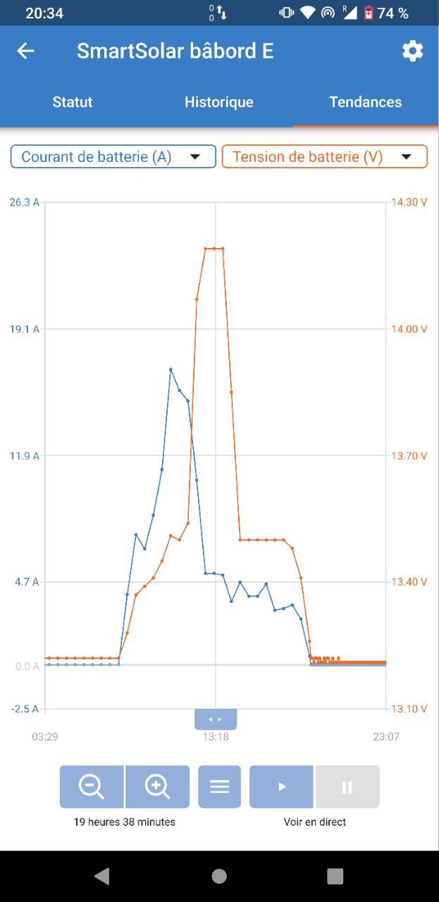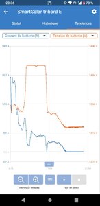 FredericL:C'est normal d'avoir une tension importante tant que la batterie se charge et accepte le courant. C'est quand le courant diminue en fin de charge qu'il faut baisser la tension, ce que semble faire ton régulateur au vu des courbes. ·le 14 nov. 00:19