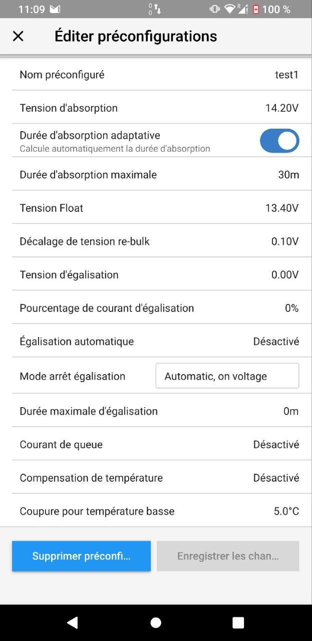 Alors, oui, avec les SmartSolar on peut configurer comme suit. J'ai mis des recopies d'écran. Je suis encore à me demander s'il faut activer le courant de queue (je ne sais pas ce que c'est), paramétrer la tension d'égalisation (je l'ai pas fait non plus)??