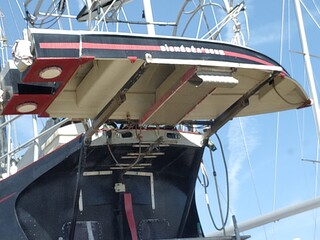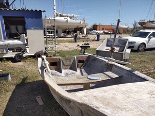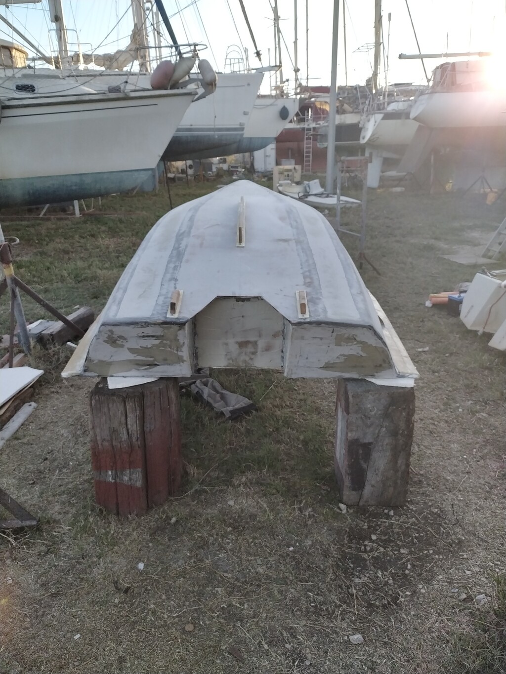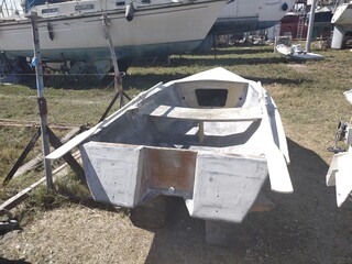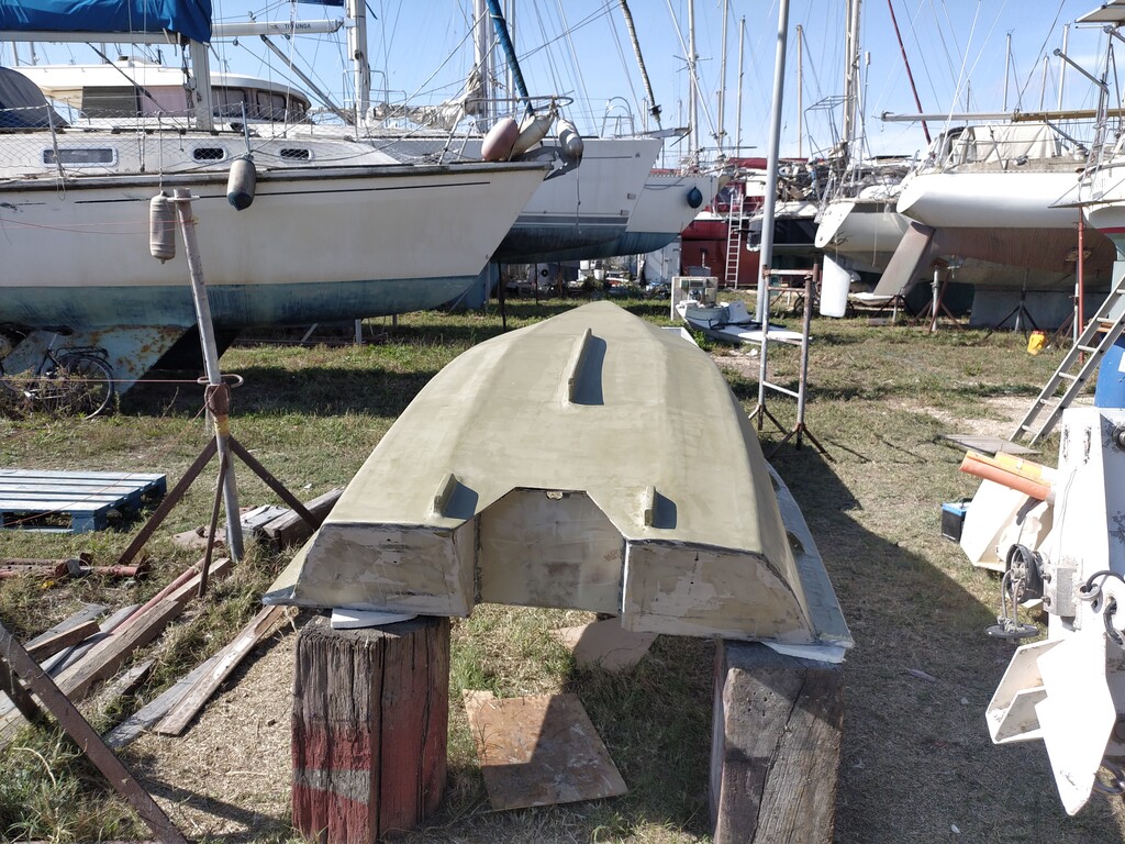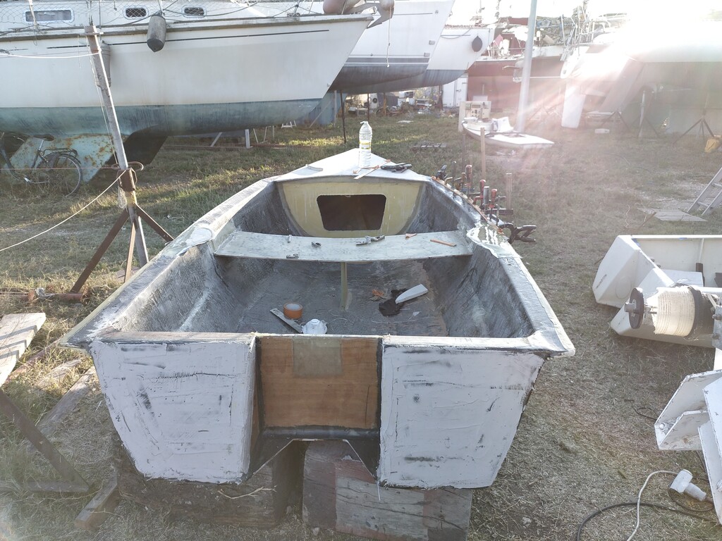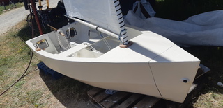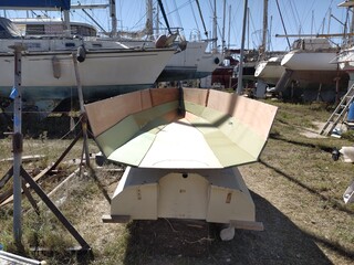 L'ancienne devait faire 60/70 kilos (trop de tri axial carbone et épaisseur inutile de cp), plus petite de qques cm,mais plus étroite et équipée avec une dérive pivotante et voile lattée.