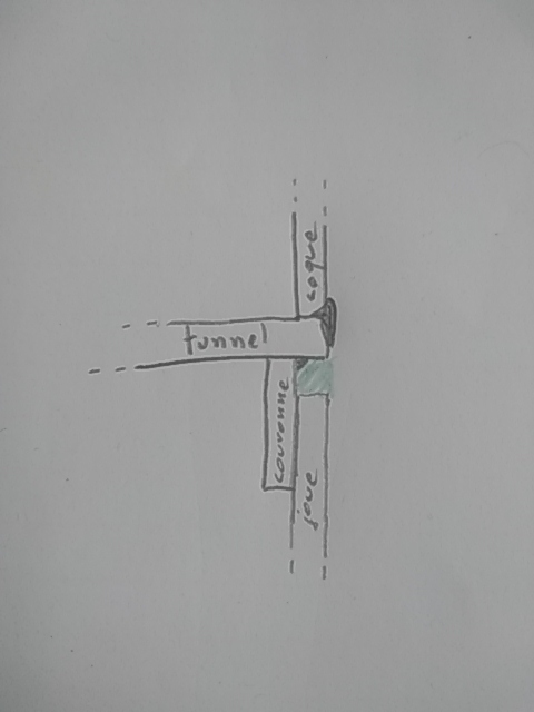 Si j'ai bien compris tu proposes de souder une "couronne" 5mm en retrait à l'intérieur du tunnel. Cette couronne est un fer plat (en rond) de 30mm de large sur 5mm d'épaisseur. On tire un trait de soudure, de l'extérieur pour souder, en continu, cette couronne au tunnel. Ensuite, on prend la joue à proprement parler, en 5mm d' épaisseur, elle fait la taille du tunnel, moins 6 ou 7mm sur le pourtour. On remplit ce creux en plusieurs passes pour fixer la joue et assurer l'étanchéité. J'ai bon ? (voir dessin)