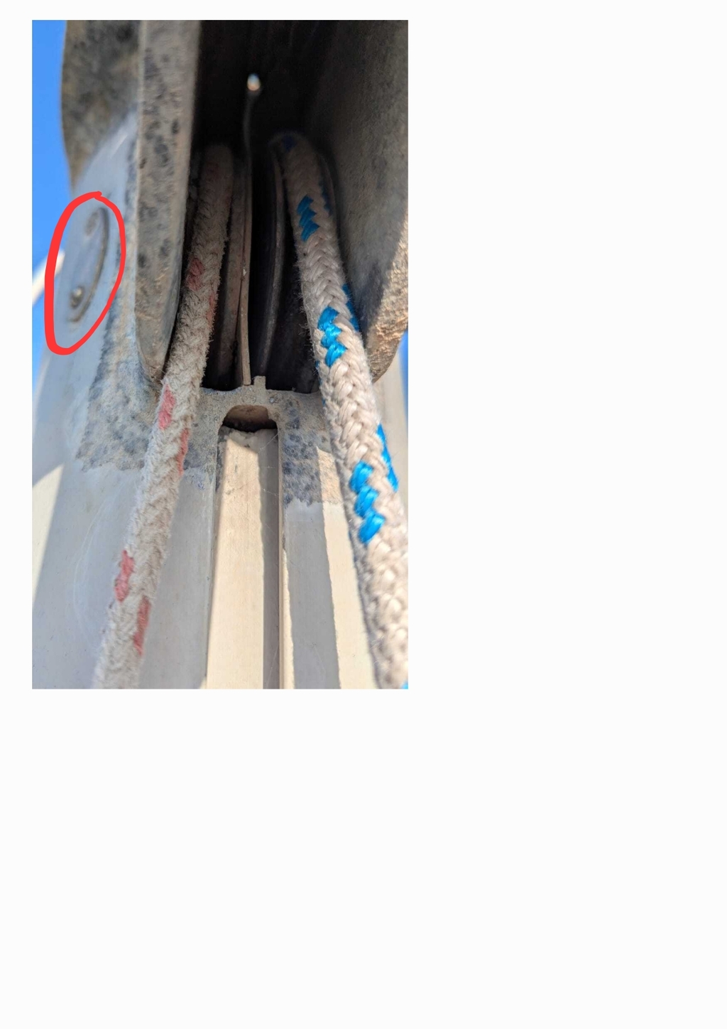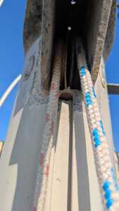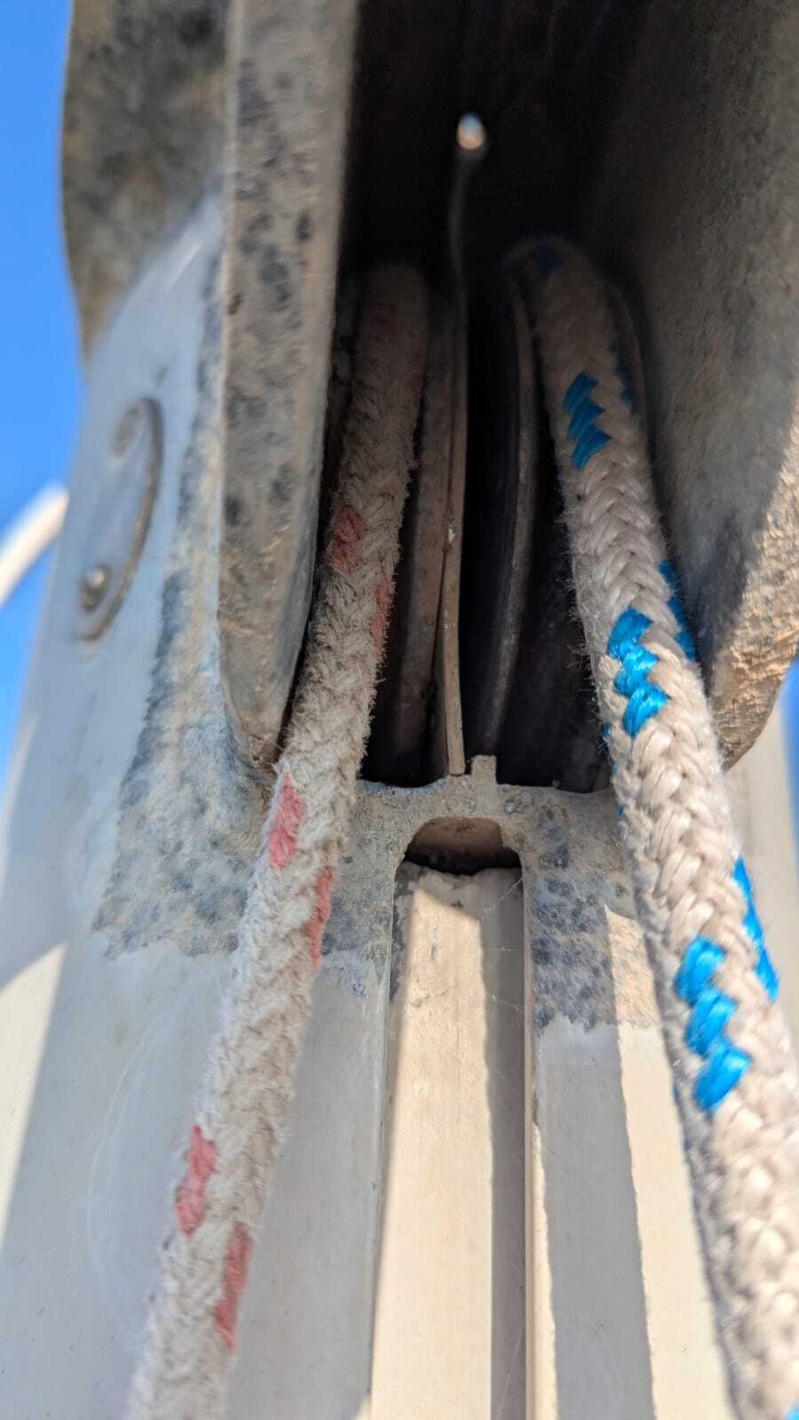 En nav, je me suis aperçu que ma balancine ne pouvait pas bouger. Une fois au port, je suis monté au mat de mon Jeanneau Mélody pour faire l'état des lieux. Là j'ai découvert un réa de balancine totalement bloqué (à gauche sur la photo) et une cloison séparatrice du réa de drisse de GV défectueuse. Ma question c'est comment réparer tout ça ? Faut il obligatoirement démâter ? Merci à toutes et tous pour vos éclairages.