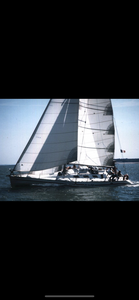 Voilier monocoque de 12 m - coque blanche et genaker bleu ciel - immatriculation provisoire du navire W24648 - 3 personnes à bord - bon niveau de navigation.