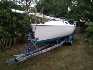 Dériveur réel, dériveur lesté, quillard, c'est pas la même chose. J'ai fait le tour en 2018 pour transporter un bateau de 610 kg (sur la bascule) et CBS était la moins chère pour 1160kg de PTAC. Attention au poids réel du bateau, 550kg sur le plan archi, c'est 650 probable+équipements. Pour le transport, démonter le moteur HB et vider la coque autant que possible. Attention au poids sur la flèche (50/70kg). Une fois le bateau en place et plus ou moins calé, régler la position de l'essieu de façon a obtenir cette valeur. Poser toutes les chandelles et rouleaux que l'on souhaite (au droit des cloisons, c'est mieux), ils sont vendus à l'unité. Vérifier la pression maxi admissible des pneus. Sur ma CBS simple essieu c'est 3kg et c'est un peu limite. Vérifier les capacités du conducteur (permis) du véhicule tracteur (CG) et de la remorque (PTAC) avant de se lancer. La marée chaussée prend en compte la capacité totale de la remorque même si vous roulez à vide. Et jamais de roues dans l'eau!!!