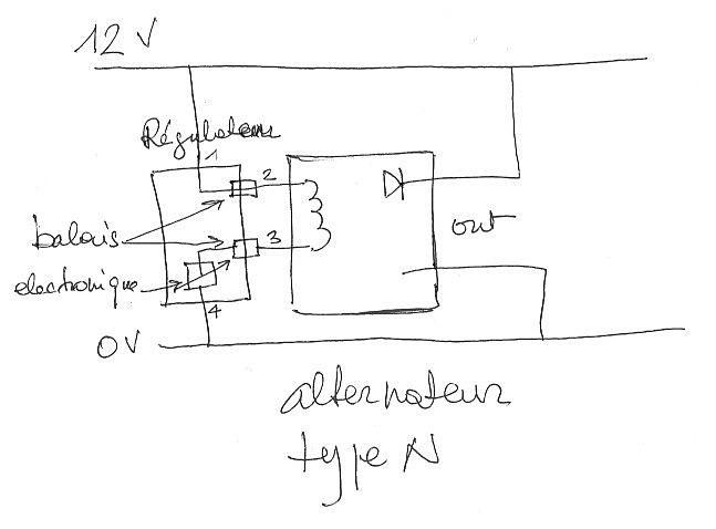 Il doit ou il va ? il faut en être sûr ! Sur mon schéma tu ne vois en fait que 2 fil le 1 B+ et le 4 la masse, les balais étant des sorties internes à l'alternateur.