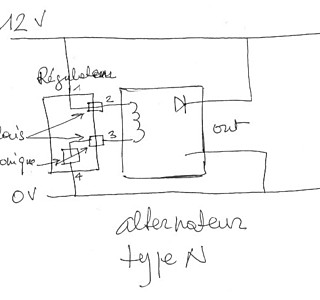 OK je ne suis pas très doué pour le dessin, mais voici en simplifié ton alternateur car il y a une forte probabilité qu'il soit de type N.