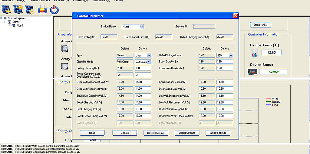 j'ai connecte le regulateur MPPT epsolar model 1215 BN à mon pc pour effectuer la configuration de la charge.
