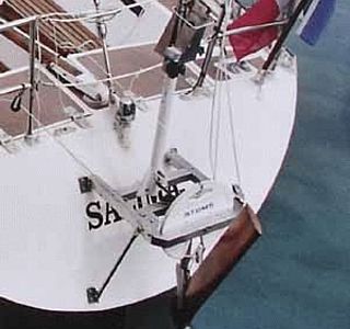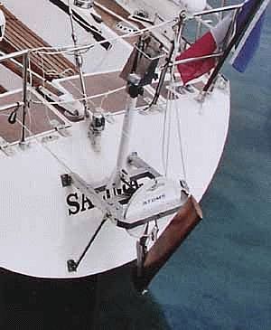 J'ai réalisé un montage très rapidement montable-démontable à base d'axes bloqués par épingles et vis à écrous papillons. Pourquoi ? Risque d'abordage ou d'aussières mal foutues dans les ports, risque de vol, risque de surcoût par nos amis "pique-sous" des ports. J'ai prévu aussi une situation intermédiaire dans laquelle en démontant seulement un des étais on peut mettre l'échelle de bain (également amovible).