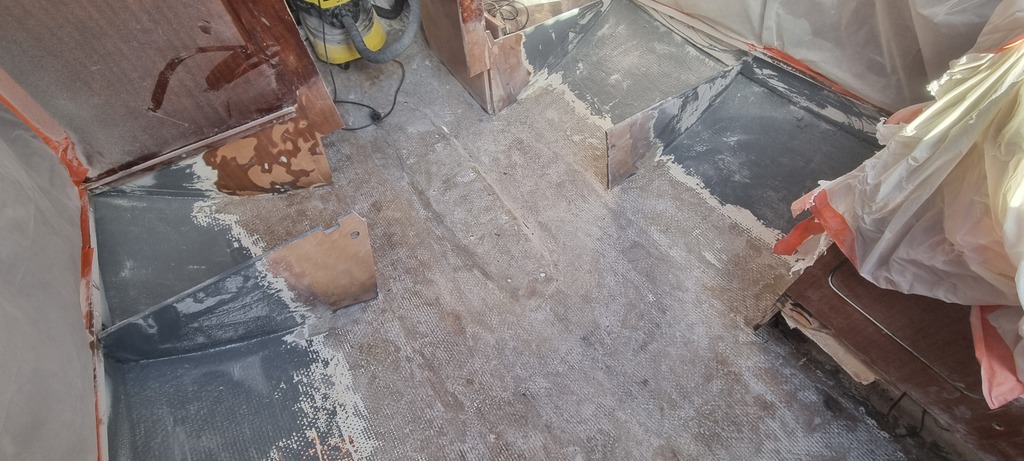 Gros travail de disquage des fonds en vue d'obtenir une surface propre pour démarrer la nouvelle strat .