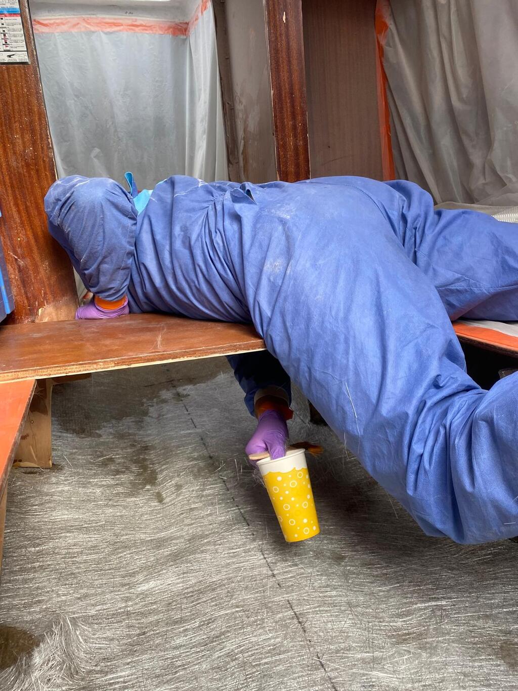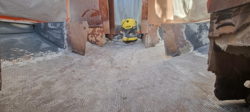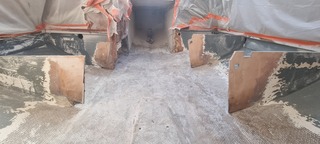 Au programme : Dématage / Déquillage. Puis je retire toutes les varangues et bas de cloisons et strat de nouvelles varangues.