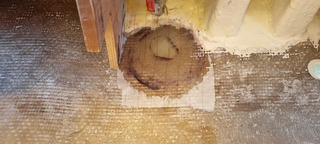 Bouchage d'un trou de passe-coque bouché il y a qqs années n'importe comment. Cette fois-ci en bizeautant intérieur et extérieur avec un ratio de 1/12 autour du trou puis strat avec superpostion de biax