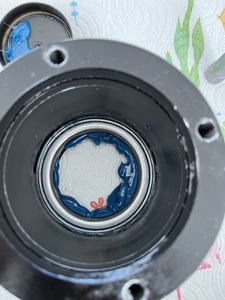 Ensuite on bourre de graisse avant de mettre le circlip extérieur du haut, puis le roulement du haut et enfin le grand circlip intérieur du haut. On finit par le joint spi du haut bien graissé et enfin la coupelle du haut.