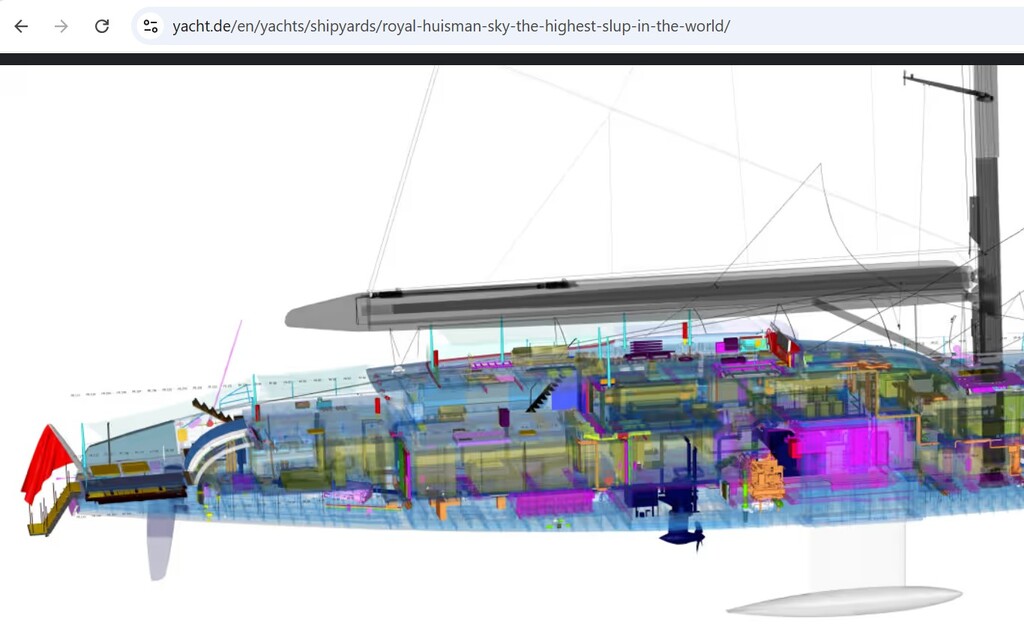 Ce futur Hollandais volant (ou coulant?) de 81m de long sera gréé en sloop et doté du mât le plus haut du monde: 95m. Le record, pour le moment.