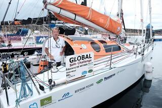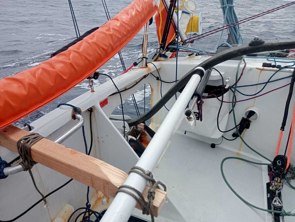 La descente qu'il a fait en dessous des 50° Sud puis la remontée obligatoire en travers des vagues, pour contourner la zone interdite des glaces, ont trop abimé le bateau et brisé le bonhomme.