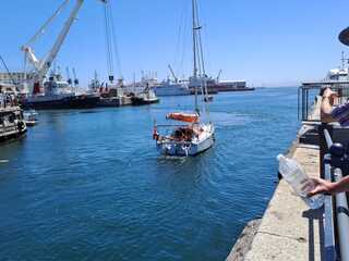 Photo 2, SOLARWIND le jour du départ. Je pensais qu'il irait jusqu'aux îles du Cap Vert pour rentrer ensuite. Puis on a chercher à le faire arrêter au Brésil , pour revenir par la Martinique ...têtu il a continué le rêve.